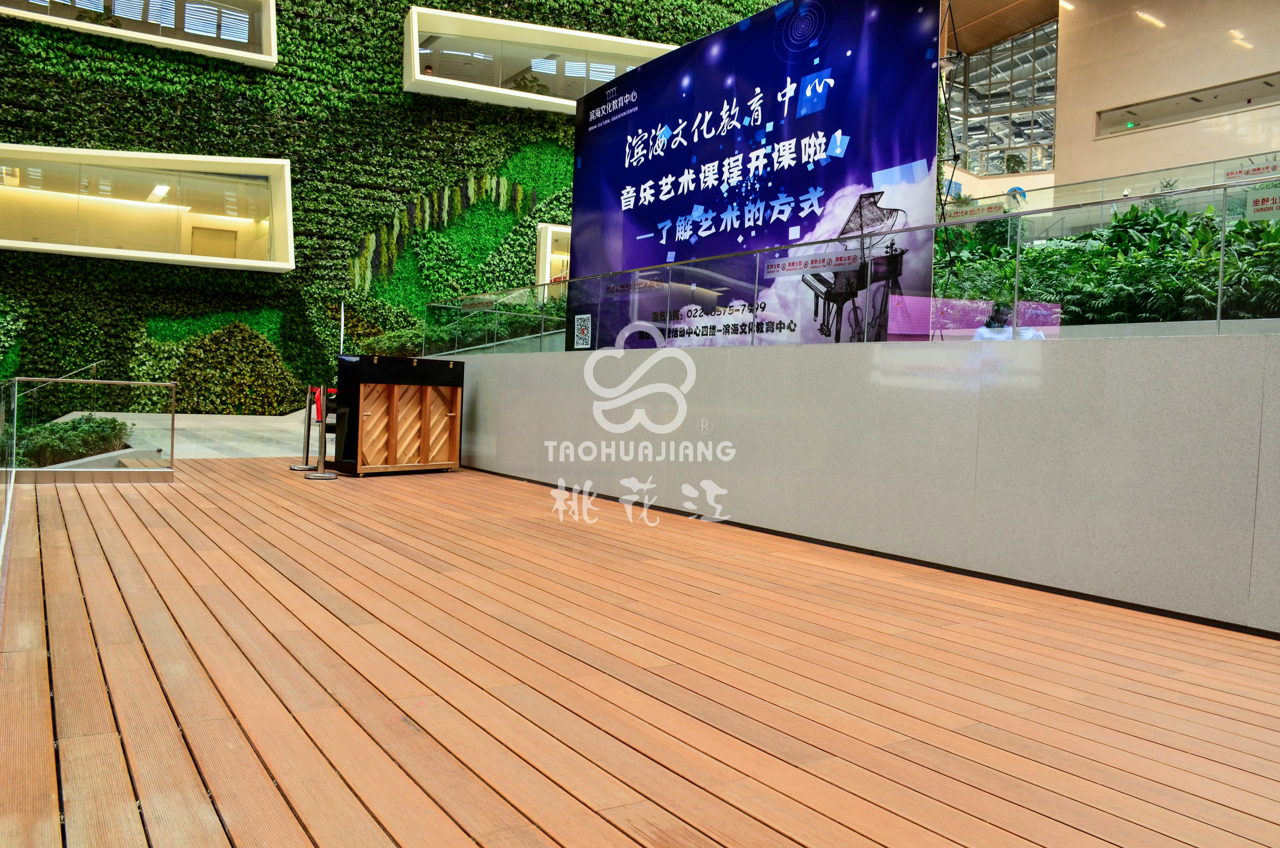 濱海新區(qū)文化中心項目中的市民活動中心區(qū)域采用桃花江戶外防腐竹地板。竹材深厚的文化底蘊與其優(yōu)異自然環(huán)保的性能一直是文化場館建設用材的首選。