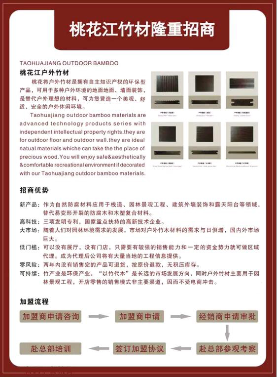 湖南桃花江竹材科技股份有限公司是湖南生產(chǎn)環(huán)保竹材的廠家,地處提名"楠竹之鄉(xiāng)"——湖南益陽市桃江縣,竹子資源得天獨厚。公司成立于2001年7月,注冊資金5076萬,為湖南省農(nóng)業(yè)產(chǎn)業(yè)化龍頭企業(yè)和湖南省林業(yè)工業(yè)龍頭企業(yè),“桃花江”牌系列竹材為湖南竹材產(chǎn)品。公司為中國林重點龍頭企業(yè)和國家高新技術(shù)企業(yè)。公司通過了ISO9001:2008國際質(zhì)量體系認證和ISO14001:2004環(huán)境管理體系認證。